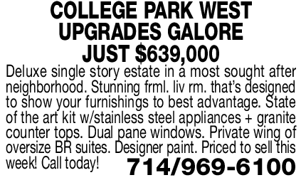 COLLEGE PARK WEST UPGRADES GALORE JUST $639,000 Deluxe single story estate in a most sought after neighborhood. Stunning frml. liv rm. that’s designed to show your furnishings to best advantage. State of the art kit w/stainless steel appliances + granite counter tops. Dual pane windows. Private wing of oversize BR suites. Designer paint. Priced to sell this week! Call today! 714/969-6100