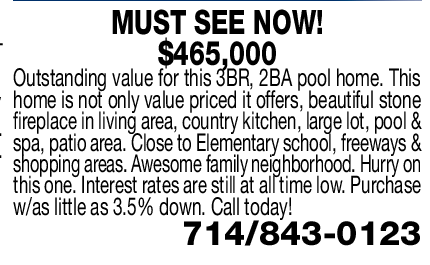 thru-out. today. MUST SEE NOW! $465,000 Outstanding value for this 3BR, 2BA pool home. This home is not only value priced it offers, beautiful stone fireplace in living area, country kitchen, large lot, pool & spa, patio area. Close to Elementary school, freeways & shopping areas. Awesome family neighborhood. Hurry on this one. Interest rates are still at all time low. Purchase w/as little as 3.5% down. Call today! 714/843-0123