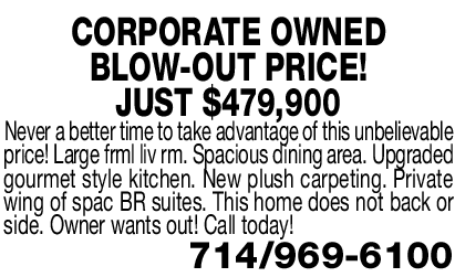 JUST $479,900 Never a better time to take advantage of this unbelievable price! Large frml liv rm. Spacious dining area. Upgraded gourmet style kitchen. New plush carpeting. Private wing of spac BR suites. This home does not back or side. Owner wants out! Call today!