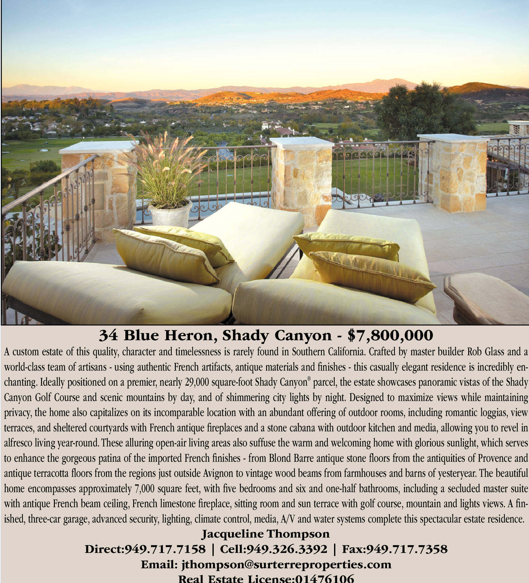 34 Blue Heron, Shady Canyon - $7,800,000 A custom estate of this quality, character and timelessness is rarely found in Southern California. Crafted by master builder Rob Glass and a world-class team of artisans - using authentic French artifacts, antique materials and finishes - this casually elegant residence is incredibly enchanting. Ideally positioned on a premier, nearly 29,000 square-foot Shady Canyon ® parcel, the estate showcases panoramic vistas of the Shady Canyon Golf Course and scenic mountains by day, and of shimmering city lights by night. Designed to maximize views while maintaining privacy, the home also capitalizes on its incomparable location with an abundant offering of outdoor rooms, including romantic loggias, view terraces, and sheltered courtyards with French antique fireplaces and a stone cabana with outdoor kitchen and media, allowing you to revel in alfresco living year-round. These alluring open-air living areas also suffuse the warm and welcoming home with glorious sunlight, which serves to enhance the gorgeous patina of the imported French finishes - from Blond Barre antique stone floors from the antiquities of Provence and antique terracotta floors from the regions just outside Avignon to vintage wood beams from farmhouses and barns of yesteryear. The beautiful home encompasses approximately 7,000 square feet, with five bedrooms and six and one-half bathrooms, including a secluded master suite with antique French beam ceiling, French limestone fireplace, sitting room and sun terrace with golf course, mountain and lights views. A finished, three-car garage, advanced security, lighting, climate control, media, A/V and water systems complete this spectacular estate residence. Jacqueline Thompson Direct:949.717.7158 | Cell:949.326.3392 | Fax:949.717.7358 Email: jthompson@surterreproperties.com Real Estate License:01476106