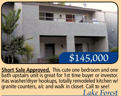 Short Sale Approved. This cute one bedroom and one bath upstairs unit is great for 1st time buyer or investor. Has washer/dryer hookups, totally remodeled kitchen w/ granite counters, a/c and walk in closet. Call to see! Lake Forest