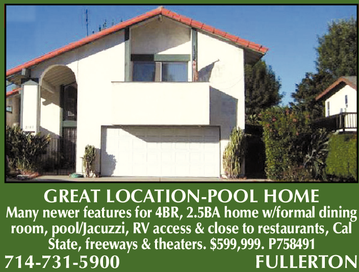 GREAT LOCATION-POOL HOME Many newer features for 4BR, 2.5BA home w/formal dining room, pool/Jacuzzi, RV access & close to restaurants, Cal State, freeways & theaters. $599,999. P758491 714-731-5900 FULLERTON