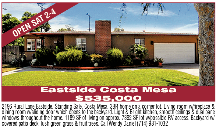 Eastside Costa Mesa $535,000 2196 Rural Lane Eastside. Standing Sale. Costa Mesa. 3BR home on a corner lot. Living room w/fireplace & dining room w/sliding door which opens to the backyard. Light & Bright kitchen, smooth ceilings & dual pane windows throughout the home. 1189 SF of living on approx. 7392 SF lot w/possible RV access. Backyard w/ covered patio deck, lush green grass & fruit trees. Call Wendy Daniel (714) 931-1032