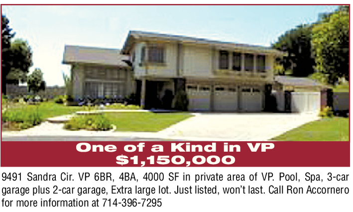 One of a Kind in VP $1,150,000 9491 Sandra Cir. VP 6BR, 4BA, 4000 SF in private area of VP. Pool, Spa, 3-car garage plus 2-car garage, Extra large lot. Just listed, won’t last. Call Ron Accornero for more information at 714-396-7295