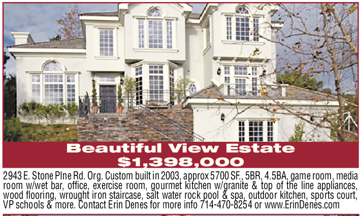 Beautiful View Estate $1,398,000 2943 E. Stone PIne Rd. Org. Custom built in 2003, approx 5700 SF., 5BR, 4.5BA, game room, media room w/wet bar, office, exercise room, gourmet kitchen w/granite & top of the line appliances, wood flooring, wrought iron staircase, salt water rock pool & spa, outdoor kitchen, sports court, VP schools & more. Contact Erin Denes for more info 714-470-8254 or www.ErinDenes.com