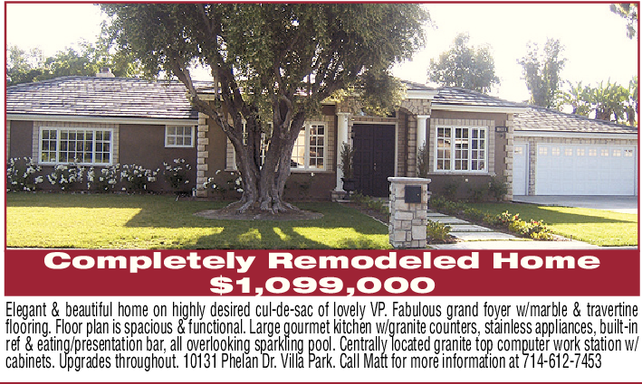 Completely Remodeled Home $1,099,000 Elegant & beautiful home on highly desired cul-de-sac of lovely VP. Fabulous grand foyer w/marble & travertine flooring. Floor plan is spacious & functional. Large gourmet kitchen w/granite counters, stainless appliances, built-in ref & eating/presentation bar, all overlooking sparkling pool. Centrally located granite top computer work station w/ cabinets. Upgrades throughout. 10131 Phelan Dr. Villa Park. Call Matt for more information at 714-612-7453