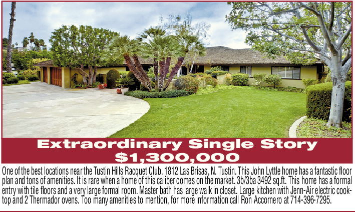 Extraordinary Single Story $1,300,000 One of the best locations near the Tustin Hills Racquet Club. 1812 Las Brisas, N. Tustin. This John Lyttle home has a fantastic floor plan and tons of amenities. It is rare when a home of this caliber comes on the market. 3b/3ba 3492 sq.ft. This home has a formal entry with tile floors and a very large formal room. Master bath has large walk in closet. Large kitchen with Jenn-Air electric cooktop and 2 Thermador ovens. Too many amenities to mention, for more information call Ron Accornero at 714-396-7295.