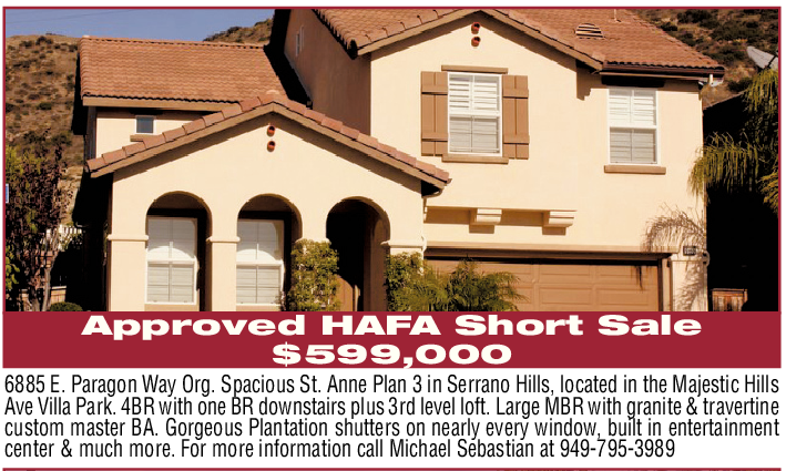 Approved HAFA Short Sale $599,000 6885 E. Paragon Way Org. Spacious St. Anne Plan 3 in Serrano Hills, located in the Majestic Hills Ave Villa Park. 4BR with one BR downstairs plus 3rd level loft. Large MBR with granite & travertine custom master BA. Gorgeous Plantation shutters on nearly every window, built in entertainment center & much more. For more information call Michael Sebastian at 949-795-3989