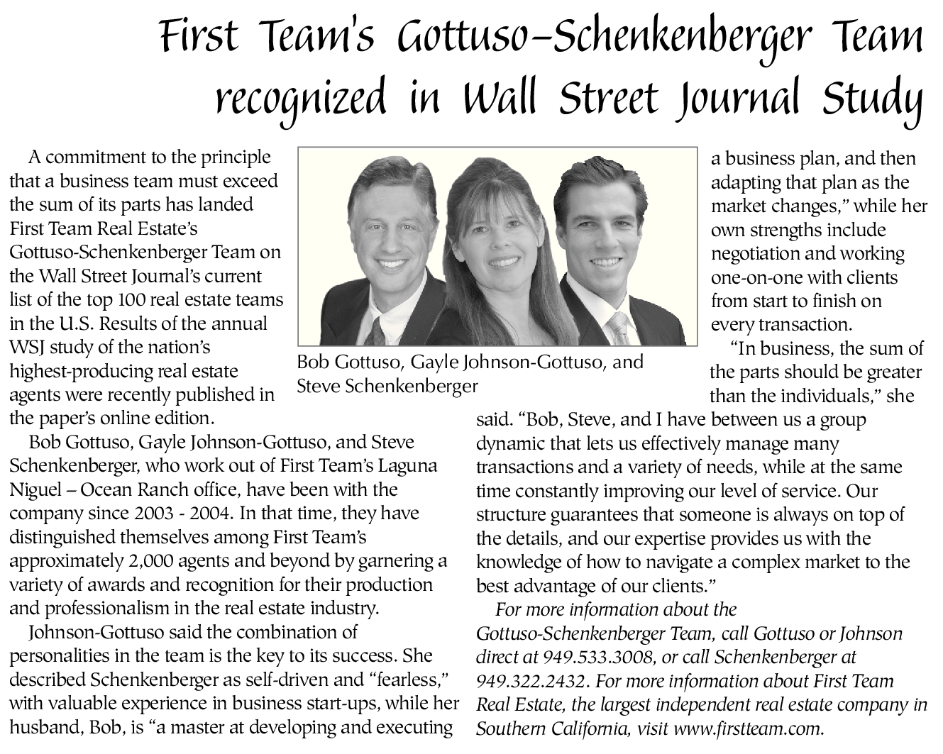First Team’s Gottuso-Schenkenberger Team recognized in Wall Street Journal Study A commitment to the principle a business plan, and then that a business team must exceed adapting that plan as the the sum of its parts has landed market changes,” while her First Team Real Estate’s own strengths include Gottuso-Schenkenberger Team on negotiation and working the Wall Street Journal’s current one-on-one with clients list of the top 100 real estate teams from start to finish on in the U.S. Results of the annual every transaction. WSJ study of the nation’s “In business, the sum of highest-producing real estate Bob Gottuso, Gayle Johnson-Gottuso, and the parts should be greater agents were recently published in Steve Schenkenberger than the individuals,” she the paper’s online edition. said. “Bob, Steve, and I have between us a group Bob Gottuso, Gayle Johnson-Gottuso, and Steve dynamic that lets us effectively manage many Schenkenberger, who work out of First Team’s Laguna transactions and a variety of needs, while at the same Niguel – Ocean Ranch office, have been with the time constantly improving our level of service. Our company since 2003 - 2004. In that time, they have structure guarantees that someone is always on top of distinguished themselves among First Team’s the details, and our expertise provides us with the approximately 2,000 agents and beyond by garnering a knowledge of how to navigate a complex market to the variety of awards and recognition for their production best advantage of our clients.” and professionalism in the real estate industry. For more information about the Johnson-Gottuso said the combination of Gottuso-Schenkenberger Team, call Gottuso or Johnson personalities in the team is the key to its success. She direct at 949.533.3008, or call Schenkenberger at described Schenkenberger as self-driven and “fearless,” 949.322.2432. For more information about First Team with valuable experience in business start-ups, while her Real Estate, the largest independent real estate company in husband, Bob, is “a master at developing and executing Southern California, visit www.firstteam.com.