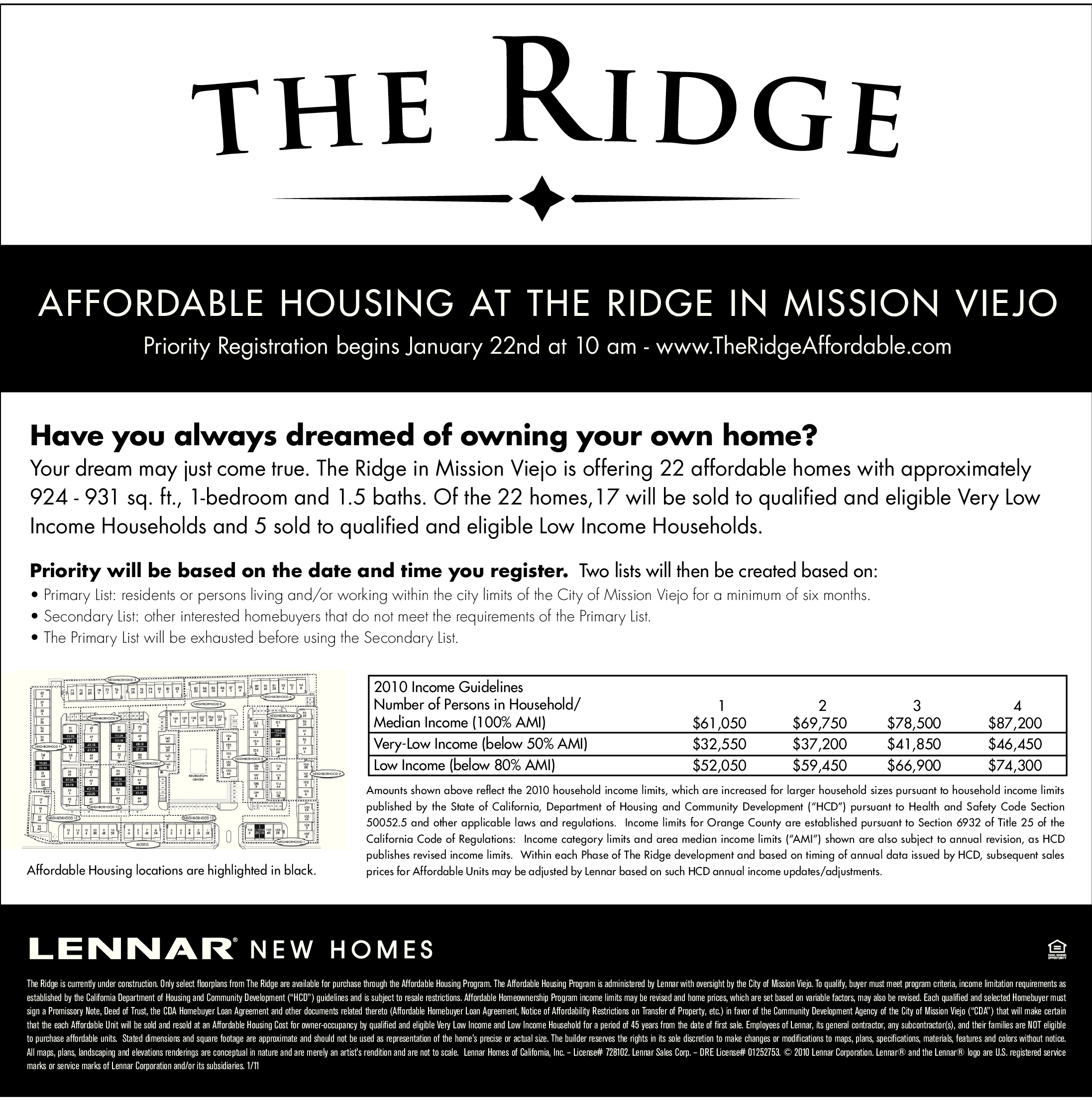 The Ridge is currently under construction. Only select floorplans from The Ridge are available for purchase through the Affordable Housing Program. The Affordable Housing Program is administered by Lennar with oversight by the City of Mission Viejo. To qualify, buyer must meet program criteria, income limitation requirements as established by the California Department of Housing and Community Development (“HCD”) guidelines and is subject to resale restrictions. Affordable Homeownership Program income limits may be revised and home prices, which are set based on variable factors, may also be revised. Each qualified and selected Homebuyer must sign a Promissory Note, Deed of Trust, the CDA Homebuyer Loan Agreement and other documents related thereto (Affordable Homebuyer Loan Agreement, Notice of Affordability Restrictions on Transfer of Property, etc.) in favor of the Community Development Agency of the City of Mission Viejo (“CDA”) that will make certain that the each Affordable Unit will be sold and resold at an Affordable Housing Cost for owner-occupancy by qualified and eligible Very Low Income and Low Income Household for a period of 45 years from the date of first sale. Employees of Lennar, its general contractor, any subcontractor(s), and their families are NOT eligible to purchase affordable units. Stated dimensions and square footage are approximate and should not be used as representation of the home’s precise or actual size. The builder reserves the rights in its sole discretion to make changes or modifications to maps, plans, specifications, materials, features and colors without notice. All maps, plans, landscaping and elevations renderings are conceptual in nature and are merely an artist’s rendition and are not to scale. Lennar Homes of California, Inc. – License# 728102. Lennar Sales Corp. – DRE License# 01252753. © 2010 Lennar Corporation. Lennar® and the Lennar® logo are U.S. registered service marks or service marks of Lennar Corporation and/or its subsidiaries. 1/11