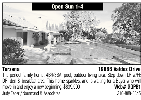 Tarzana 19666 Valdez Drive The perfect family home. 4BR/3BA, pool, outdoor living area. Step down LR w/FP, move in and enjoy a new beginning. $839,500 Web# GQPB1 DR, den & breakfast area. This home sparkles, and is waiting for a Buyer who will Judy Feder / Nourmand & Associates 310-888-3345