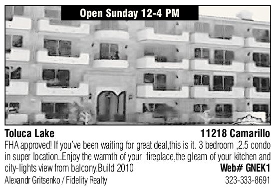 Toluca Lake 11218 Camarillo FHA approved! If you’ve been waiting for great deal,this is it. 3 bedroom ,2.5 condo in super location..Enjoy the warmth of your fireplace,the gleam of your kitchen and city-lights view from balcony.Build 2010 Web# GNEK1 Alexandr Gritsenko / Fidelity Realty 323-333-8691