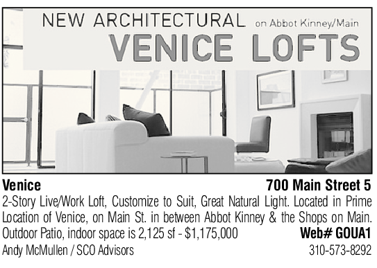 Venice 700 Main Street 5 2-Story Live/Work Loft, Customize to Suit, Great Natural Light. Located in Prime Location of Venice, on Main St. in between Abbot Kinney & the Shops on Main. Outdoor Patio, indoor space is 2,125 sf - $1,175,000 Web# GOUA1 Andy McMullen / SCO Advisors 310-573-8292