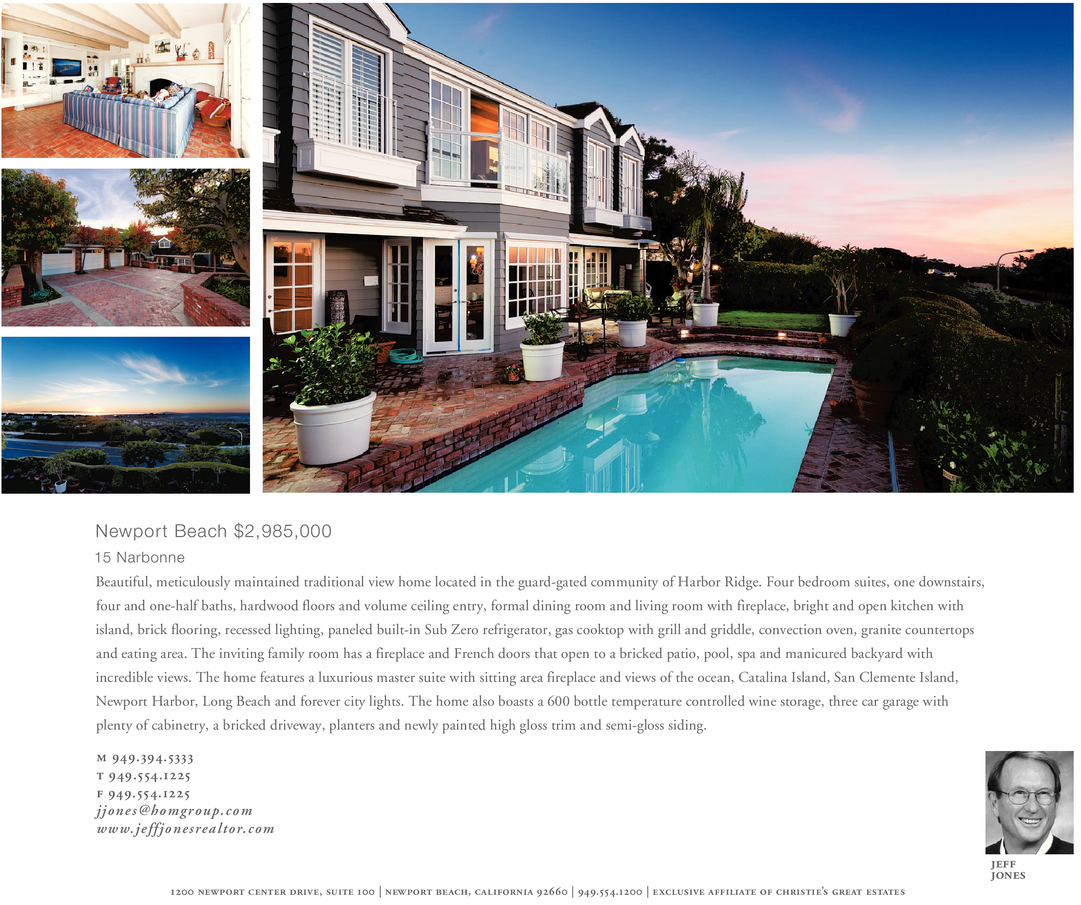 Newport Beach $2,985,000 15 Narbonne Beautiful, meticulously maintained traditional view home located in the guard-gated community of Harbor Ridge. Four bedroom suites, one downstairs, four and one-half baths, hardwood floors and volume ceiling entry, formal dining room and living room with fireplace, bright and open kitchen with island, brick flooring, recessed lighting, paneled built-in Sub Zero refrigerator, gas cooktop with grill and griddle, convection oven, granite countertops and eating area. The inviting family room has a fireplace and French doors that open to a bricked patio, pool, spa and manicured backyard with incredible views. The home features a luxurious master suite with sitting area fireplace and views of the ocean, Catalina Island, San Clemente Island, Newport Harbor, Long Beach and forever city lights. The home also boasts a 600 bottle temperature controlled wine storage, three car garage with plenty of cabinetry, a bricked driveway, planters and newly painted high gloss trim and semi-gloss siding.