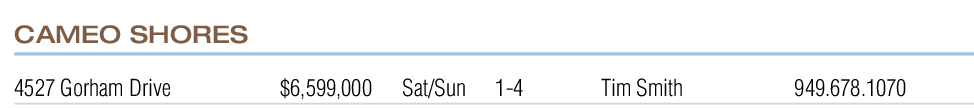 4527 Gorham Drive $6,599,000 Sat/Sun 1-4 Tim Smith 949.678.1070