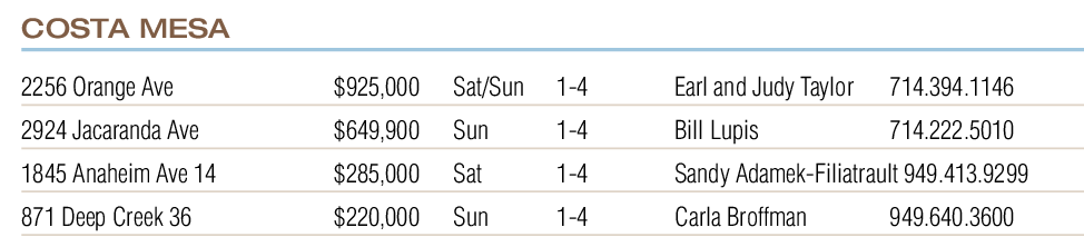 2256 Orange Ave $925,000 Sat/Sun 1-4 Earl and Judy Taylor 714.394.1146 2924 Jacaranda Ave $649,900 Sun 1-4 Bill Lupis 714.222.5010 1845 Anaheim Ave 14 $285,000 Sat 1-4 Sandy Adamek-Filiatrault 949.413.9299 871 Deep Creek 36 $220,000 Sun 1-4 Carla Broffman 949.640.3600