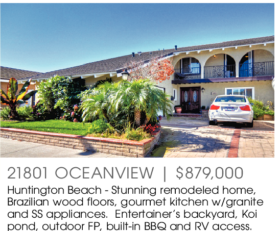 21801 OCEANVIEW | $879,000 Huntington Beach - Stunning remodeled home, Brazilian wood floors, gourmet kitchen w/granite and SS appliances. Entertainer’s backyard, Koi pond, outdoor FP, built-in BBQ and RV access.