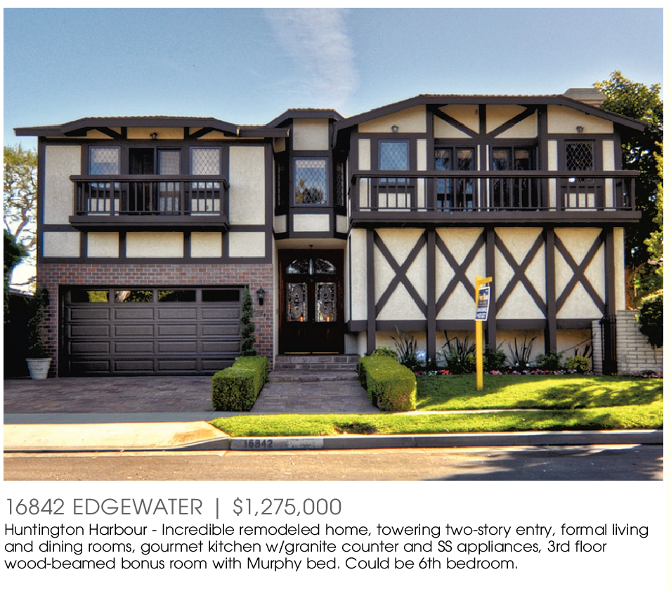 16842 EDGEWATER | $1,275,000 Huntington Harbour - Incredible remodeled home, towering two-story entry, formal living and dining rooms, gourmet kitchen w/granite counter and SS appliances, 3rd floor wood-beamed bonus room with Murphy bed. Could be 6th bedroom.