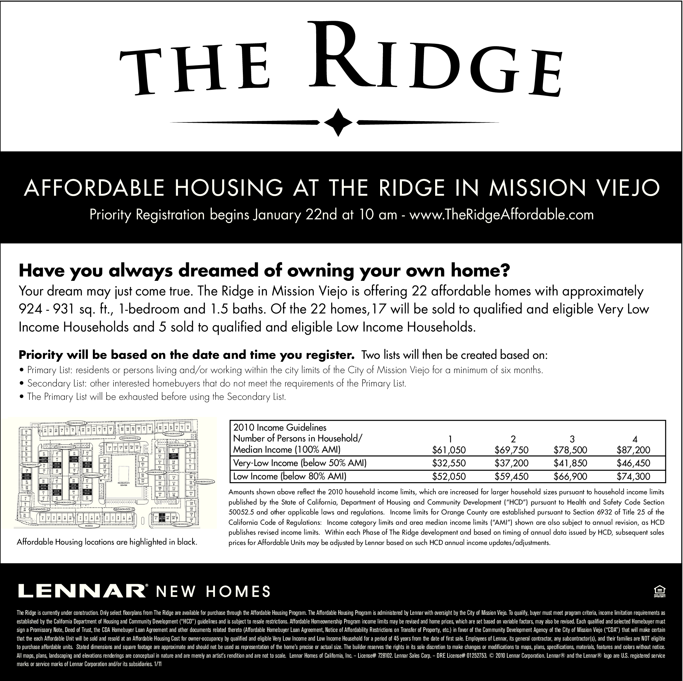 The Ridge is currently under construction. Only select floorplans from The Ridge are available for purchase through the Affordable Housing Program. The Affordable Housing Program is administered by Lennar with oversight by the City of Mission Viejo. To qualify, buyer must meet program criteria, income limitation requirements as established by the California Department of Housing and Community Development (“HCD”) guidelines and is subject to resale restrictions. Affordable Homeownership Program income limits may be revised and home prices, which are set based on variable factors, may also be revised. Each qualified and selected Homebuyer must sign a Promissory Note, Deed of Trust, the CDA Homebuyer Loan Agreement and other documents related thereto (Affordable Homebuyer Loan Agreement, Notice of Affordability Restrictions on Transfer of Property, etc.) in favor of the Community Development Agency of the City of Mission Viejo (“CDA”) that will make certain that the each Affordable Unit will be sold and resold at an Affordable Housing Cost for owner-occupancy by qualified and eligible Very Low Income and Low Income Household for a period of 45 years from the date of first sale. Employees of Lennar, its general contractor, any subcontractor(s), and their families are NOT eligible to purchase affordable units. Stated dimensions and square footage are approximate and should not be used as representation of the home’s precise or actual size. The builder reserves the rights in its sole discretion to make changes or modifications to maps, plans, specifications, materials, features and colors without notice. All maps, plans, landscaping and elevations renderings are conceptual in nature and are merely an artist’s rendition and are not to scale. Lennar Homes of California, Inc. – License# 728102. Lennar Sales Corp. – DRE License# 01252753. © 2010 Lennar Corporation. Lennar® and the Lennar® logo are U.S. registered service marks or service marks of Lennar Corporation and/or its subsidiaries. 1/11