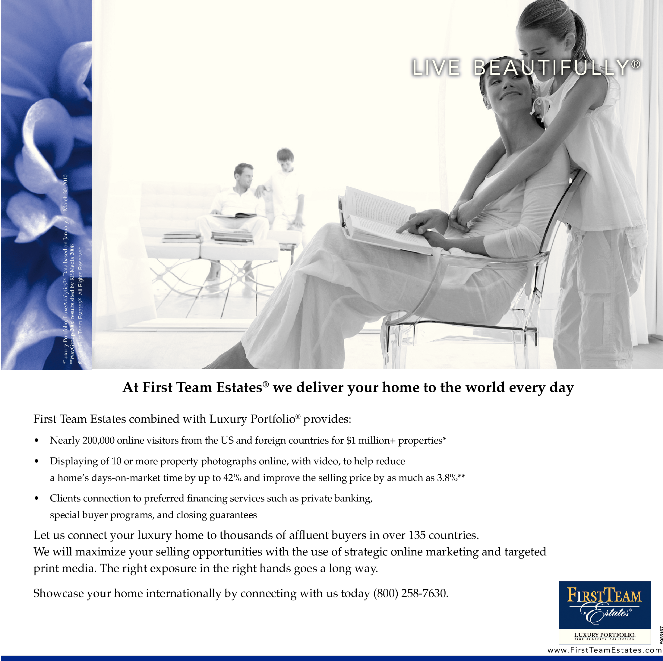 At First Team Estates ® we deliver your home to the world every day First Team Estates combined with Luxury Portfolio ® provides: • Nearly 200,000 online visitors from the US and foreign countries for $1 million+ properties* • Displaying of 10 or more property photographs online, with video, to help reduce a home’s days-on-market time by up to 42% and improve the selling price by as much as 3.8%** • Clients connection to preferred financing services such as private banking, special buyer programs, and closing guarantees Let us connect your luxury home to thousands of affluent buyers in over 135 countries. We will maximize your selling opportunities with the use of strategic online marketing and targeted print media. The right exposure in the right hands goes a long way. Showcase your home internationally by connecting with us today (800) 258-7630. L I V E B E A U T I F U L L Y ® www.FirstTeamEstates.com