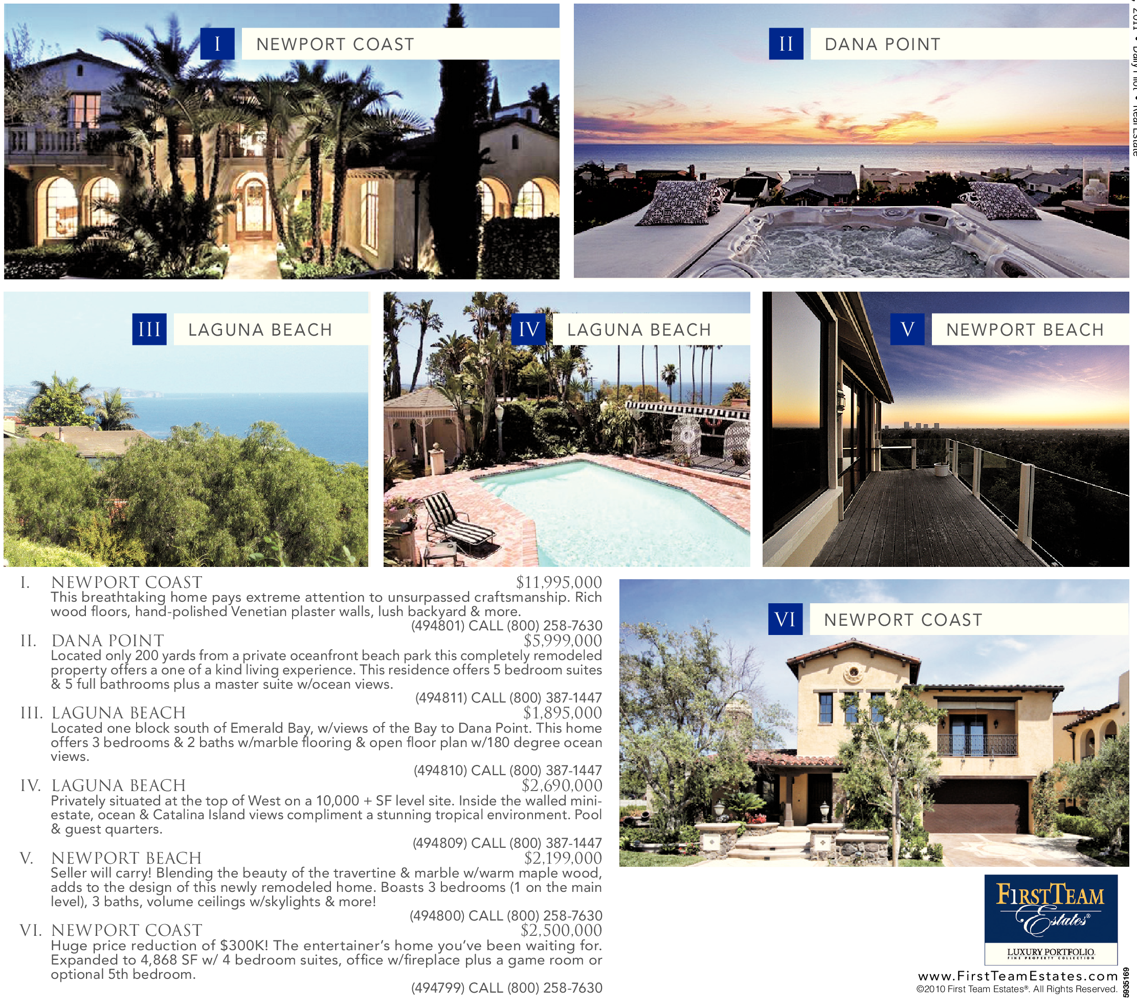 (494800) CALL (800) 258-7630 VI. NEWPORT COAST $2,500,000 Huge price reduction of $300K! The entertainer’s home you’ve been waiting for. Expanded to 4,868 SF w/ 4 bedroom suites, office w/fireplace plus a game room or optional 5th bedroom.