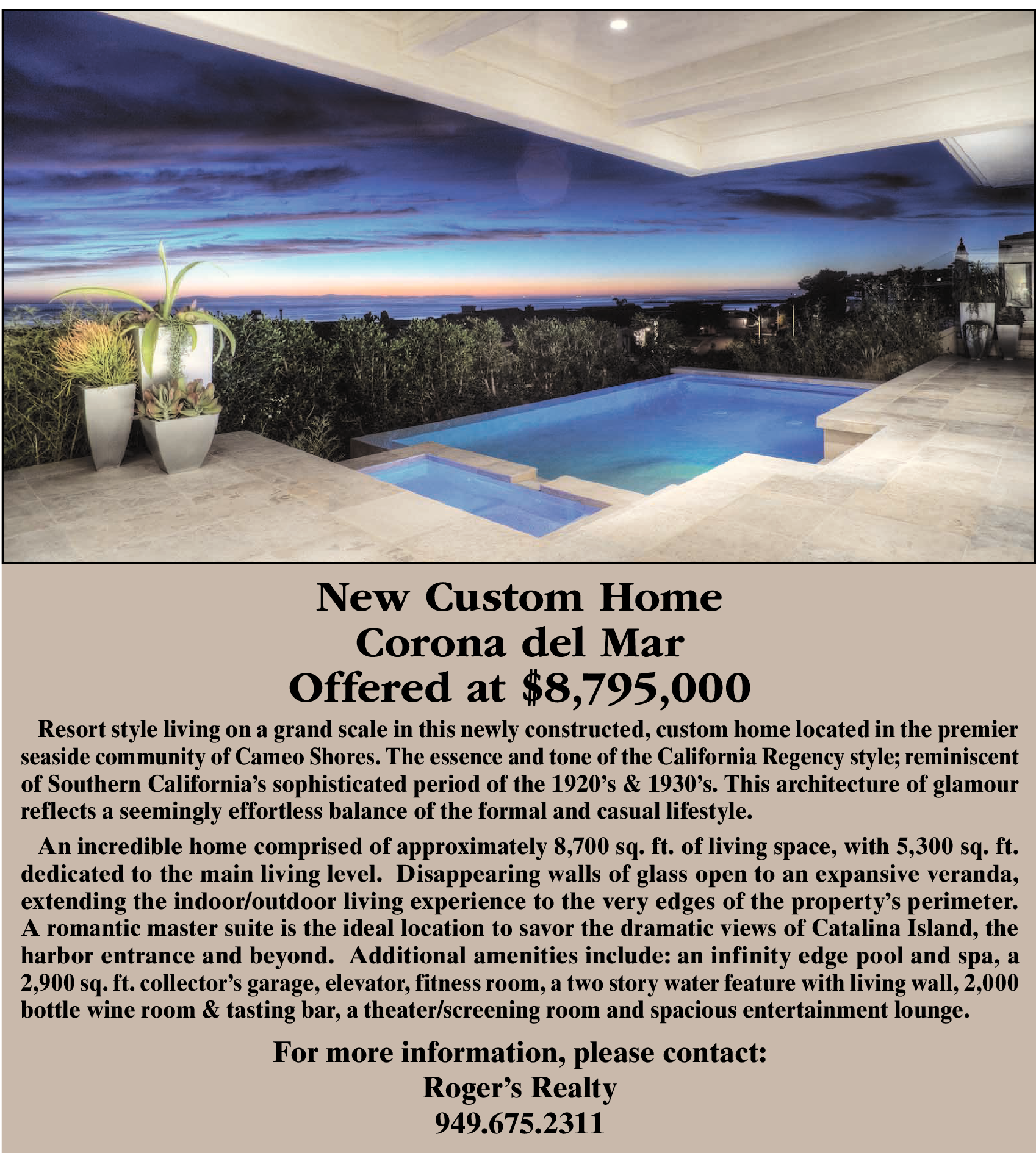 New Custom Home Corona del Mar Offered at $8,795,000 Resort style living on a grand scale in this newly constructed, custom home located in the premier seaside community of Cameo Shores. The essence and tone of the California Regency style; reminiscent of Southern California’s sophisticated period of the 1920’s & 1930’s. This architecture of glamour reflects a seemingly effortless balance of the formal and casual lifestyle. An incredible home comprised of approximately 8,700 sq. ft. of living space, with 5,300 sq. ft. dedicated to the main living level. Disappearing walls of glass open to an expansive veranda, extending the indoor/outdoor living experience to the very edges of the property’s perimeter. A romantic master suite is the ideal location to savor the dramatic views of Catalina Island, the harbor entrance and beyond. Additional amenities include: an infinity edge pool and spa, a 2,900 sq. ft. collector’s garage, elevator, fitness room, a two story water feature with living wall, 2,000 bottle wine room & tasting bar, a theater/screening room and spacious entertainment lounge. For more information, please contact: Roger’s Realty 949.675.2311