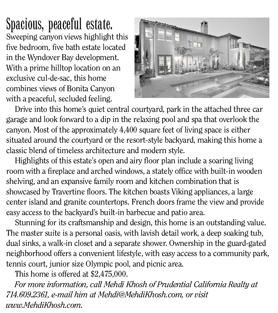 This home is offered at $2,475,000. For more information, call Mehdi Khosh of Prudential California Realty at 714.609.2361, e-mail him at Mehdi@MehdiKhosh.com, or visit www.MehdiKhosh.com.