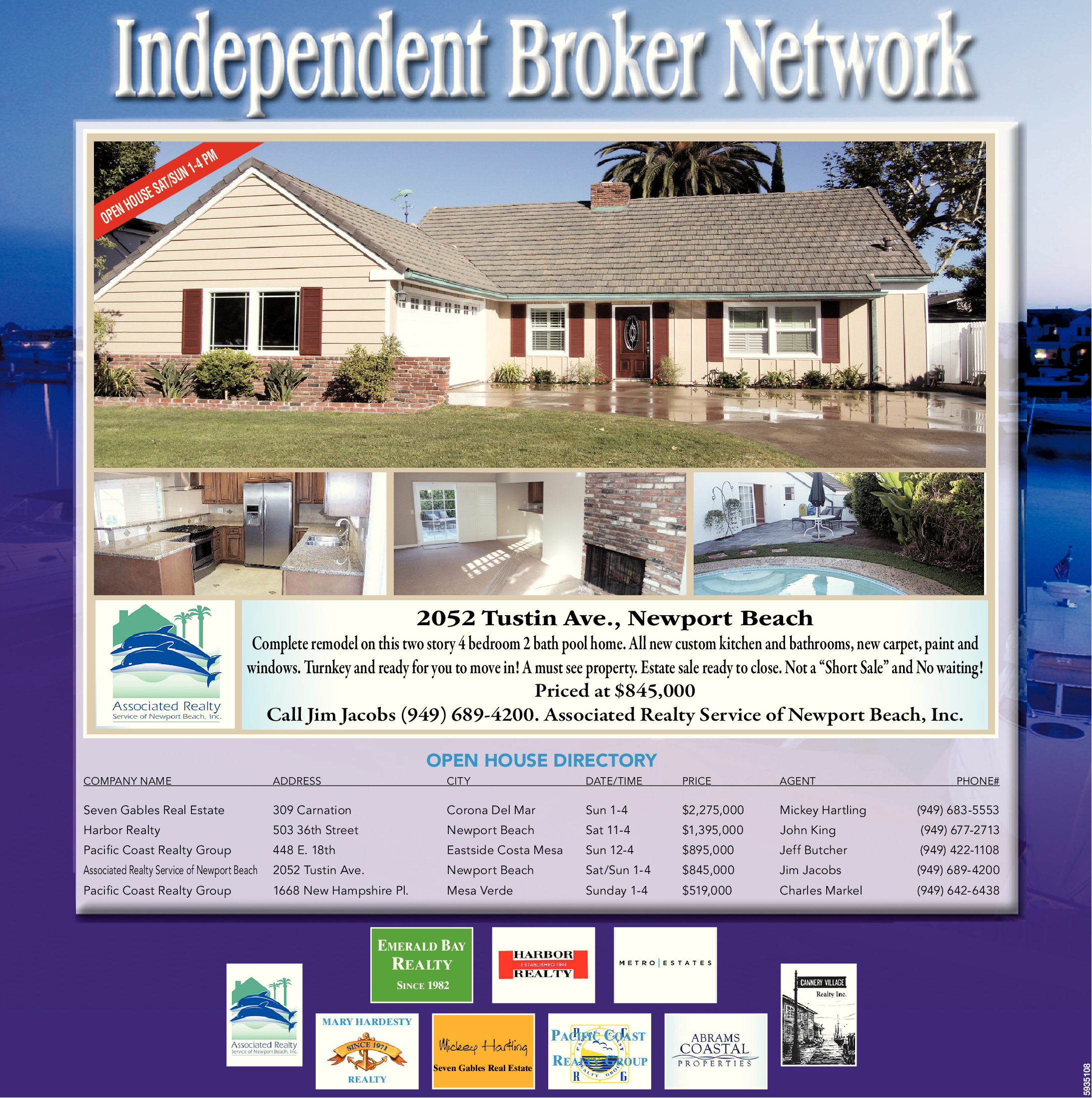 2052 Tustin Ave., Newport Beach Complete remodel on this two story 4 bedroom 2 bath pool home. All new custom kitchen and bathrooms, new carpet, paint and windows. Turnkey and ready for you to move in! A must see property. Estate sale ready to close. Not a “Short Sale” and No waiting! Priced at $845,000 Call Jim Jacobs (949) 689-4200. Associated Realty Service of Newport Beach, Inc. OPEN HOUSE DIRECTORY COMPANY NAME ADDRESS CITY DATE/TIME PRICE AGENT PHONE# Seven Gables Real Estate 309 Carnation Corona Del Mar Sun 1-4 $2,275,000 Mickey Hartling (949) 683-5553 Harbor Realty 503 36th Street Newport Beach Sat 11-4 $1,395,000 John King (949) 677-2713 Pacific Coast Realty Group 448 E. 18th Eastside Costa Mesa Sun 12-4 $895,000 Jeff Butcher (949) 422-1108 Associated Realty Service of Newport Beach 2052 Tustin Ave. Newport Beach Sat/Sun 1-4 $845,000 Jim Jacobs (949) 689-4200 Pacific Coast Realty Group 1668 New Hampshire Pl. Mesa Verde Sunday 1-4 $519,000 Charles Markel (949) 642-6438 MARY HARDESTY REALTY EMERALD BAY REALTY SINCE 1982 Seven Gables Real Estate PACIFIC COAST REALTY GROUP