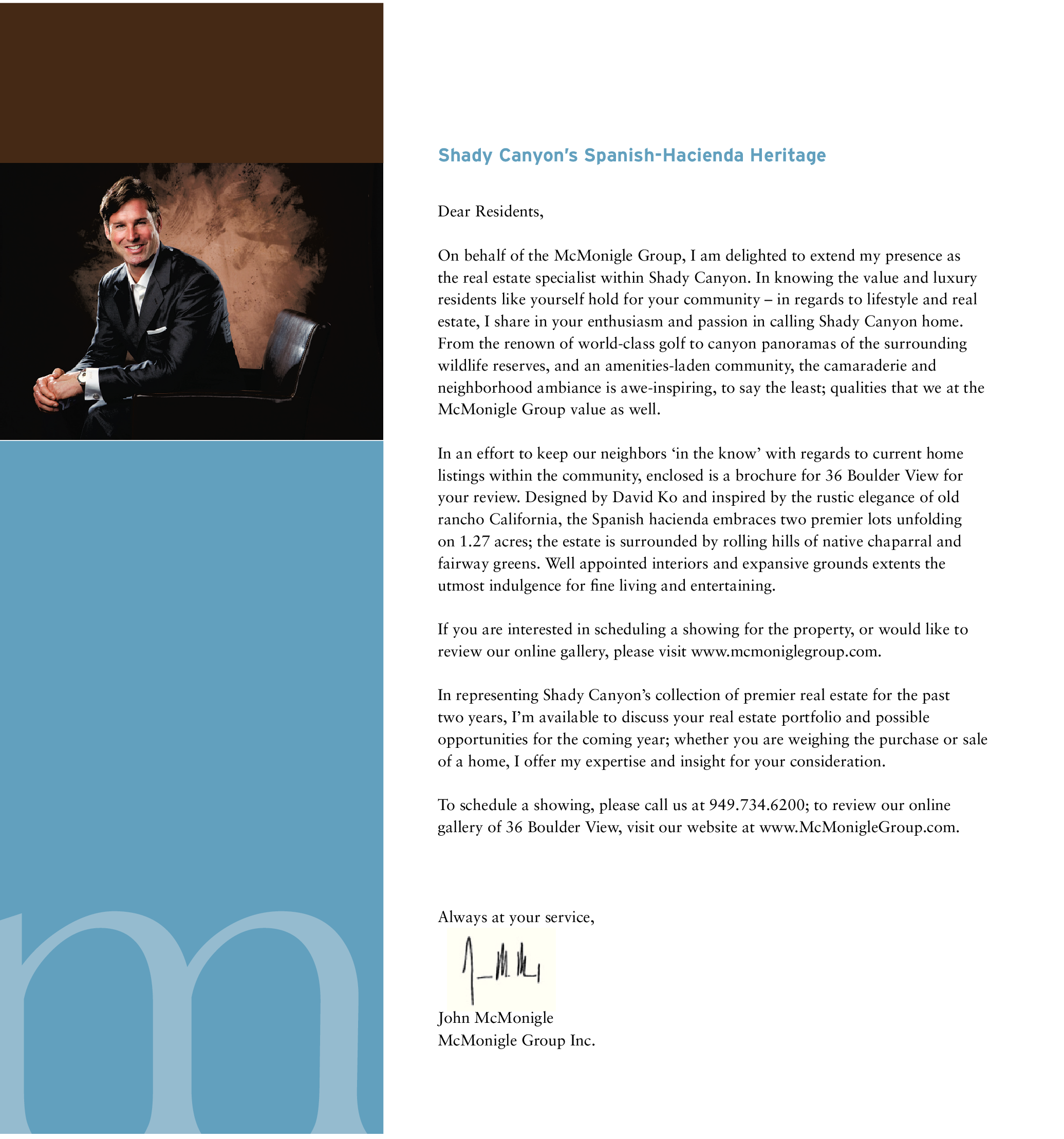In an effort to keep our neighbors ‘in the know’ with regards to current home listings within the community, enclosed is a brochure for 36 Boulder View for your review. Designed by David Ko and inspired by the rustic elegance of old rancho California, the Spanish hacienda embraces two premier lots unfolding on 1.27 acres; the estate is surrounded by rolling hills of native chaparral and fairway greens. Well appointed interiors and expansive grounds extents the utmost indulgence for fine living and entertaining.
