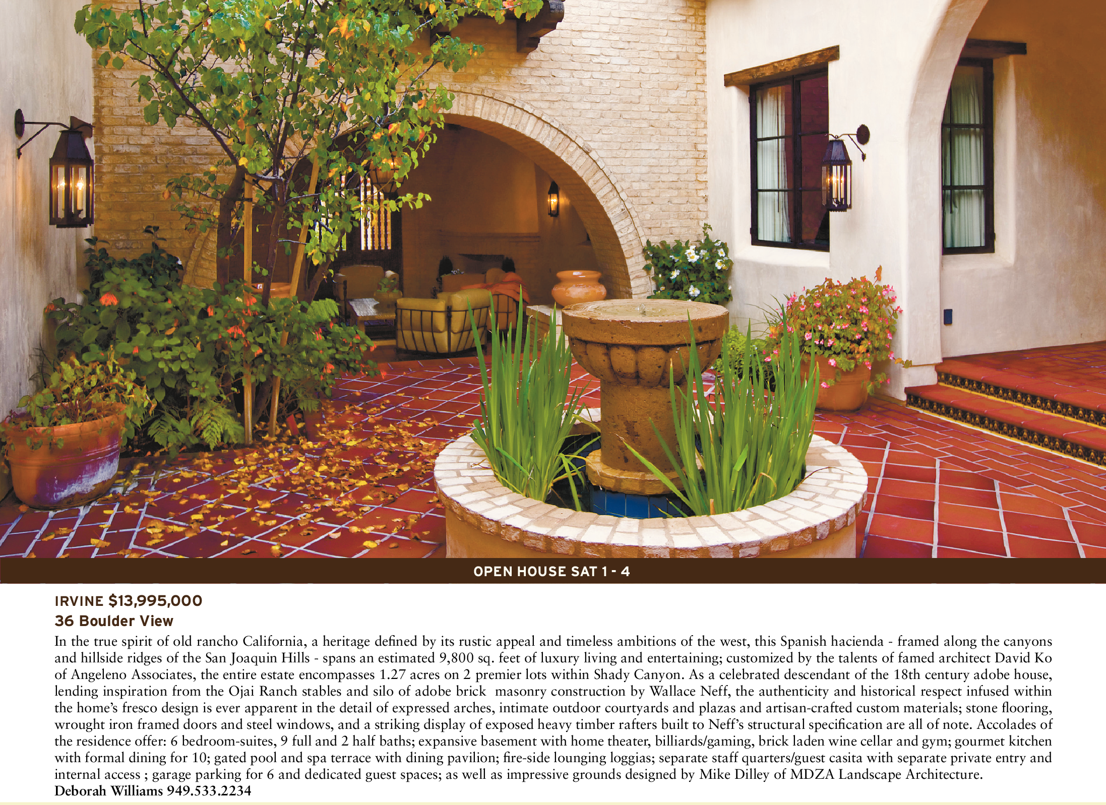 IRVINE $13,995,000 36 Boulder View In the true spirit of old rancho California, a heritage defined by its rustic appeal and timeless ambitions of the west, this Spanish hacienda - framed along the canyons and hillside ridges of the San Joaquin Hills - spans an estimated 9,800 sq. feet of luxury living and entertaining; customized by the talents of famed architect David Ko of Angeleno Associates, the entire estate encompasses 1.27 acres on 2 premier lots within Shady Canyon. As a celebrated descendant of the 18th century adobe house, lending inspiration from the Ojai Ranch stables and silo of adobe brick masonry construction by Wallace Neff, the authenticity and historical respect infused within the home’s fresco design is ever apparent in the detail of expressed arches, intimate outdoor courtyards and plazas and artisan-crafted custom materials; stone flooring, wrought iron framed doors and steel windows, and a striking display of exposed heavy timber rafters built to Neff’s structural specification are all of note. Accolades of the residence offer: 6 bedroom-suites, 9 full and 2 half baths; expansive basement with home theater, billiards/gaming, brick laden wine cellar and gym; gourmet kitchen with formal dining for 10; gated pool and spa terrace with dining pavilion; fire-side lounging loggias; separate staff quarters/guest casita with separate private entry and internal access ; garage parking for 6 and dedicated guest spaces; as well as impressive grounds designed by Mike Dilley of MDZA Landscape Architecture. Deborah Williams 949.533.2234 OPEN HOUSE SAT 1 - 4