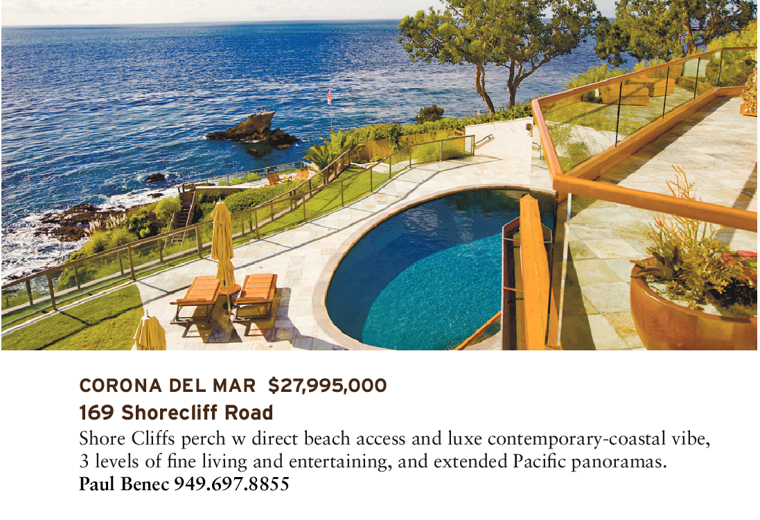 CORONA DEL MAR $27,995,000 169 Shorecliff Road Shore Cliffs perch w direct beach access and luxe contemporary-coastal vibe, 3 levels of fine living and entertaining, and extended Pacific panoramas. Paul Benec 949.697.8855