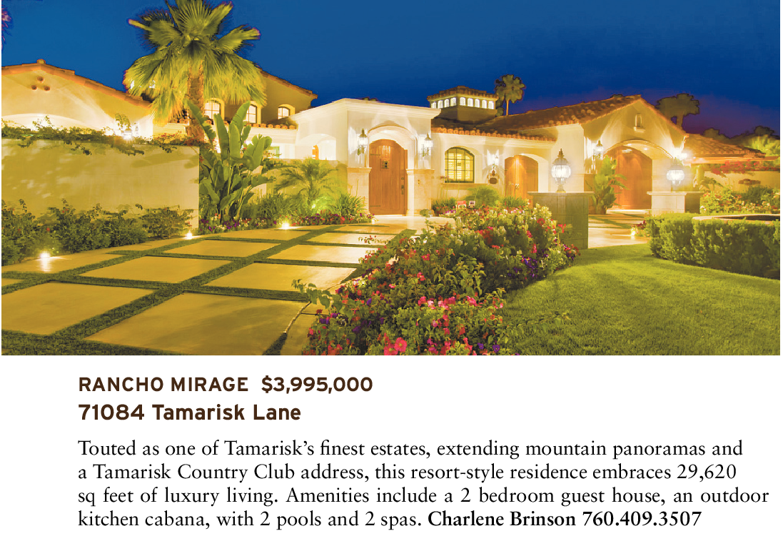 Touted as one of Tamarisk’s finest estates, extending mountain panoramas and a Tamarisk Country Club address, this resort-style residence embraces 29,620 sq feet of luxury living. Amenities include a 2 bedroom guest house, an outdoor kitchen cabana, with 2 pools and 2 spas. Charlene Brinson 760.409.3507