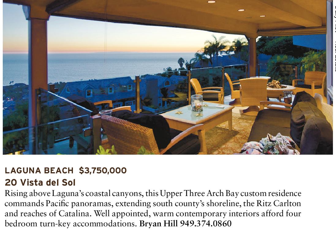 LAGUNA BEACH $3,750,000 20 Vista del Sol Rising above Laguna’s coastal canyons, this Upper Three Arch Bay custom residence commands Pacific panoramas, extending south county’s shoreline, the Ritz Carlton and reaches of Catalina. Well appointed, warm contemporary interiors afford four bedroom turn-key accommodations. Bryan Hill 949.374.0860