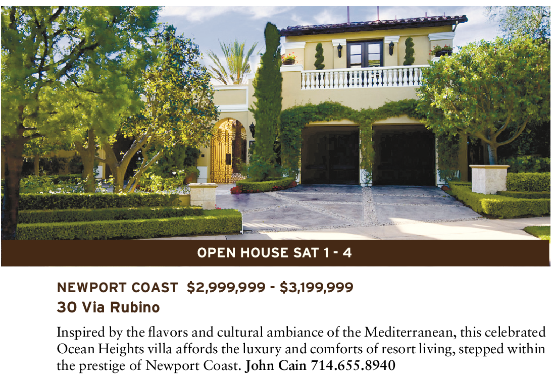 OPEN HOUSE SAT 1 - 4 NEWPORT COAST $2,999,999 - $3,199,999 30 Via Rubino Inspired by the flavors and cultural ambiance of the Mediterranean, this celebrated Ocean Heights villa affords the luxury and comforts of resort living, stepped within the prestige of Newport Coast. John Cain 714.655.8940