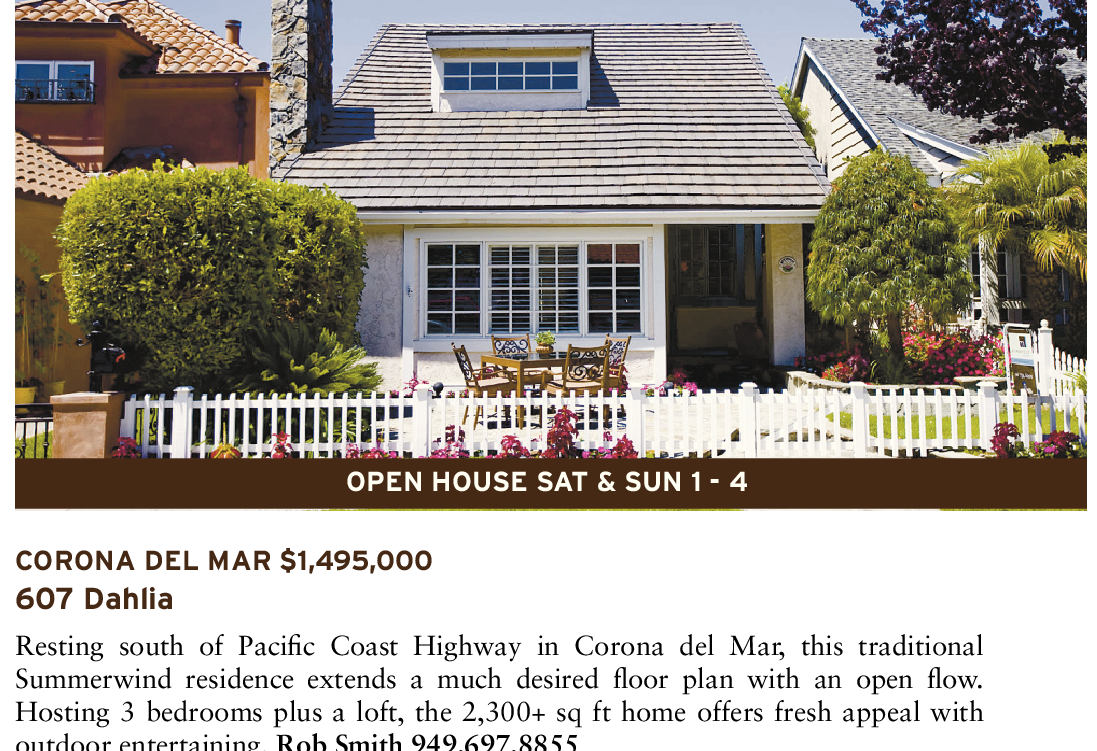 CORONA DEL MAR $1,495,000 607 Dahlia OPEN HOUSE SAT & SUN 1 - 4 Resting south of Pacific Coast Highway in Corona del Mar, this traditional Summerwind residence extends a much desired floor plan with an open flow. Hosting 3 bedrooms plus a loft, the 2,300+ sq ft home offers fresh appeal with outdoor entertaining. Rob Smith 949.697.8855