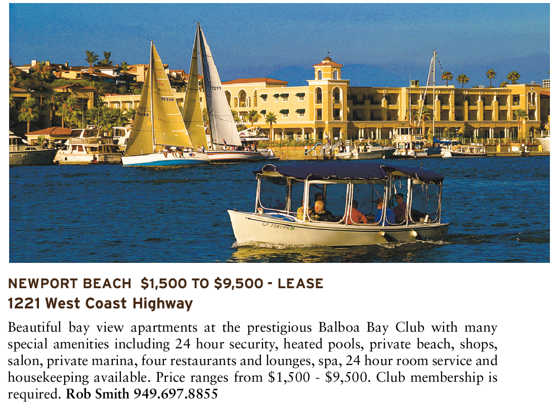 NEWPORT BEACH $1,500 TO $9,500 - LEASE 1221 West Coast Highway Beautiful bay view apartments at the prestigious Balboa Bay Club with many special amenities including 24 hour security, heated pools, private beach, shops, salon, private marina, four restaurants and lounges, spa, 24 hour room service and housekeeping available. Price ranges from $1,500 - $9,500. Club membership is required. Rob Smith 949.697.8855