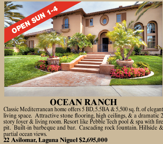 OCEAN RANCH Classic Mediterranean home offers 5 BD, 5.5BA & 5,500 sq. ft. of elegant living space. Attractive stone flooring, high ceilings, & a dramatic 2 story foyer & living room. Resort like Pebble Tech pool & spa with fire pit. Built-in barbeque and bar. Cascading rock fountain. Hillside & partial ocean views. 22 Asilomar, Laguna Niguel $2,695,000