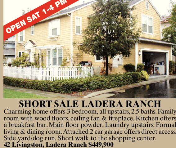SHORT SALE LADERA RANCH Charming home offers 3 bedroom, all upstairs, 2.5 baths. Family room with wood floors, ceiling fan & fireplace. Kitchen offers a breakfast bar. Main floor powder. Laundry upstairs. Formal living & dining room.Attached 2 car garage offers direct access. Side yard/dog run. Short walk to the shopping center. 42 Livingston, Ladera Ranch $449,900