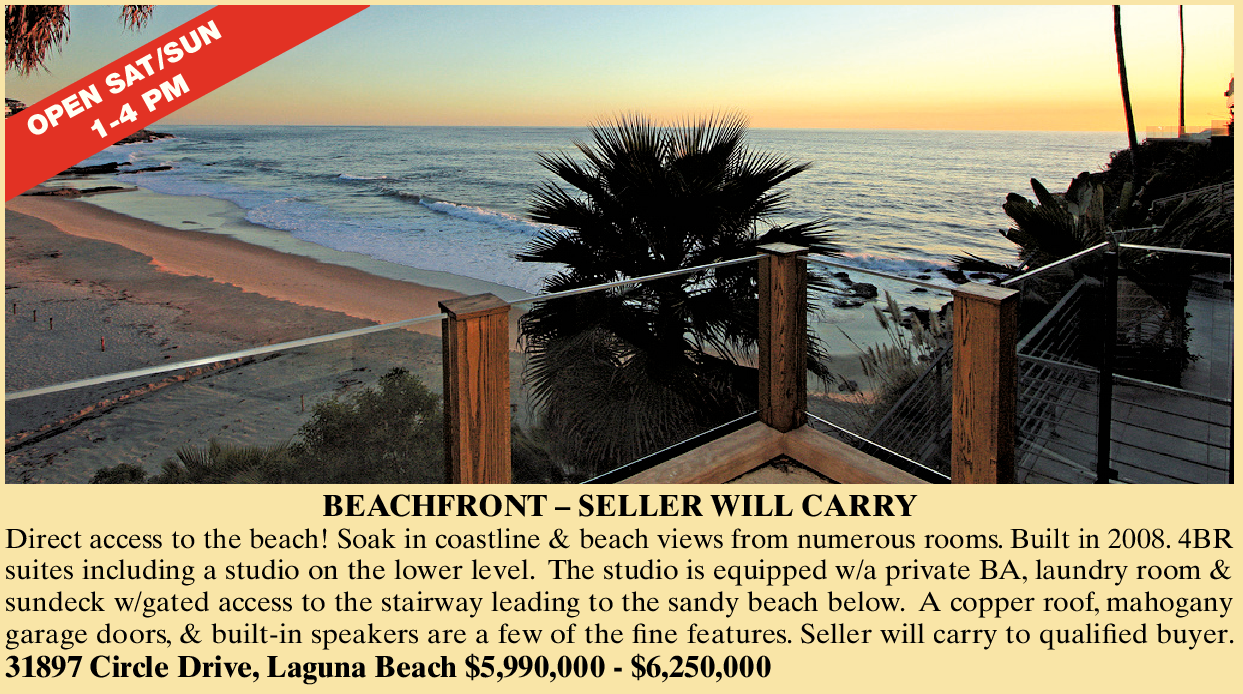 BEACHFRONT – SELLER WILL CARRY Direct access to the beach! Soak in coastline & beach views from numerous rooms. Built in 2008. 4BR suites including a studio on the lower level. The studio is equipped w/a private BA, laundry room & sundeck w/gated access to the stairway leading to the sandy beach below. A copper roof, mahogany garage doors, & built-in speakers are a few of the fine features. Seller will carry to qualified buyer. 31897 Circle Drive, Laguna Beach $5,990,000 - $6,250,000