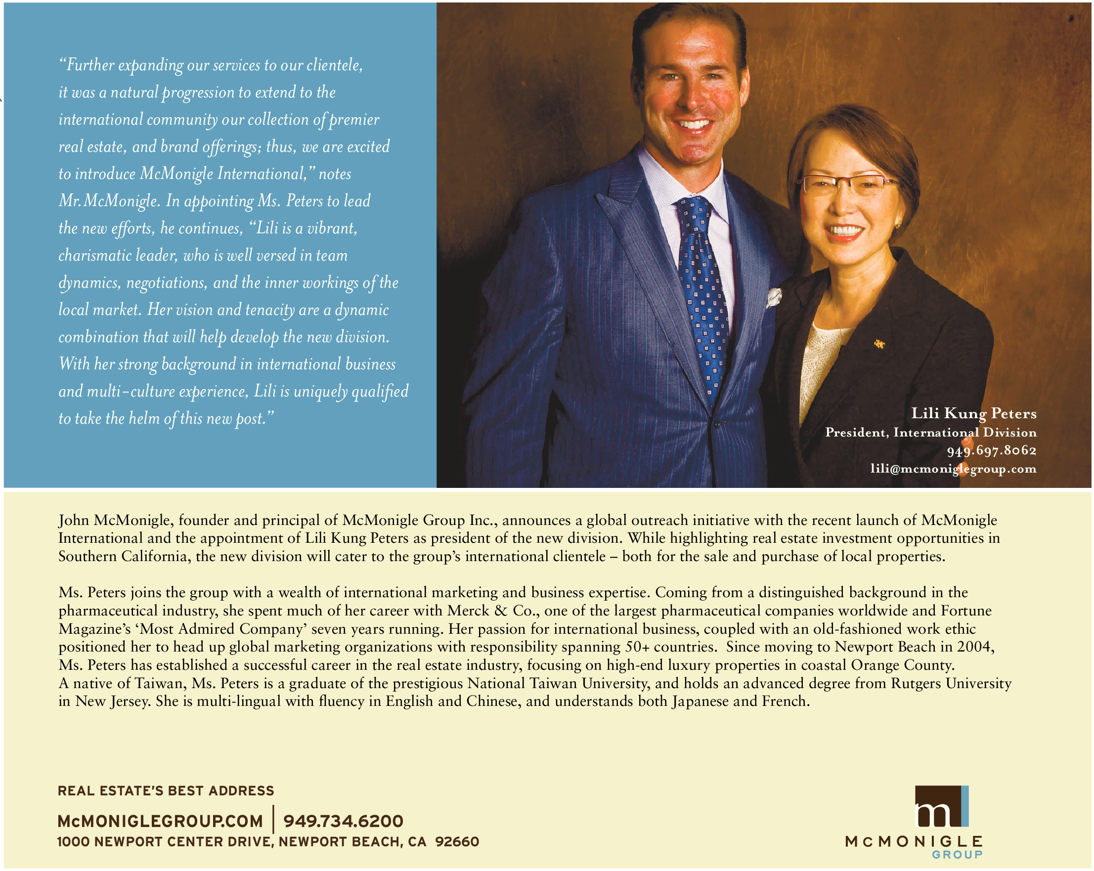 John McMonigle, founder and principal of McMonigle Group Inc., announces a global outreach initiative with the recent launch of McMonigle International and the appointment of Lili Kung Peters as president of the new division. While highlighting real estate investment opportunities in Southern California, the new division will cater to the group’s international clientele – both for the sale and purchase of local properties.