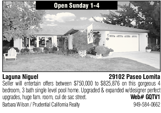 Laguna Niguel 29102 Paseo Lomita Seller will entertain offers between $750,000 to $825,876 on this gorgeous 4 bedroom, 3 bath single level pool home. Upgraded & expanded w/designer perfect upgrades, huge fam. room, cul de sac street. Web# GQTV1 Barbara Wilson / Prudential California Realty 949-584-0662