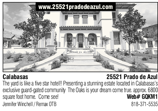 www.25521pradodeazul.com Calabasas 25521 Prado de Azul The yard is like a five star hotel!! Presenting a stunning estate located in Calabasas’s exclusive guard-gated community The Oaks is your dream come true. approx. 6800 square foot home. Come see! Web# GQKM1 Jennifer Winchell / Remax OTB 818-371-5535