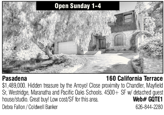 Open Sunday 1-4 Pasadena 160 California Terrace $1,489,000. Hidden treasure by the Arroyo! Close proximity to Chandler, Mayfield Sr, Westridge, Maranatha and Pacific Oaks Schools. 4500+ SF w/ detached guest house/studio. Great buy! Low cost/SF for this area. Web# GQTE1 Debra Fallon / Coldwell Banker 626-844-2280 See also