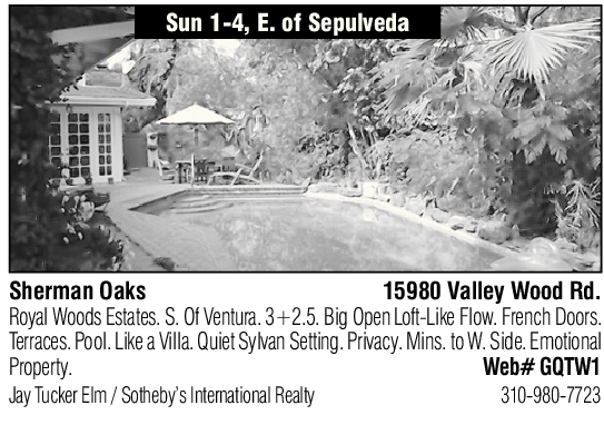Sherman Oaks 15980 Valley Wood Rd. Royal Woods Estates. S. Of Ventura. 3+2.5. Big Open Loft-Like Flow. French Doors. Terraces. Pool. Like a Villa. Quiet Sylvan Setting. Privacy. Mins. to W. Side. Emotional Property. Web# GQTW1 Jay Tucker Elm / Sotheby’s International Realty 310-980-7723
