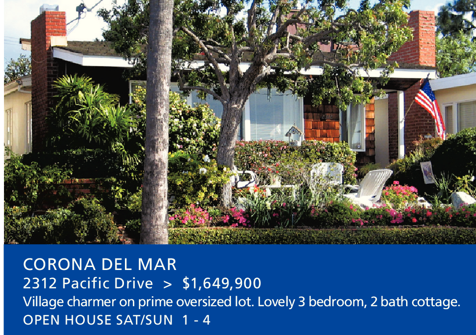 CORONA DEL MAR 2312 Pacific Drive > $1,649,900 Villagecharmeronprimeoversizedlot.Lovely3bedroom,2bathcottage. OPEN HOUSE SAT/SUN 1 - 4