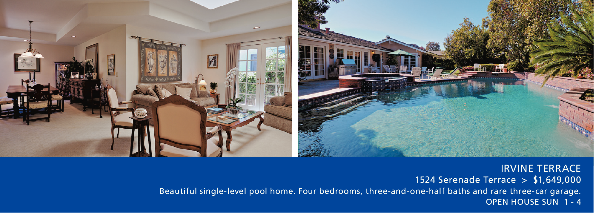 IRVINE TERRACE 1524 Serenade Terrace > $1,649,000 Beautiful single-level pool home. Four bedrooms, three-and-one-half baths and rare three-car garage.