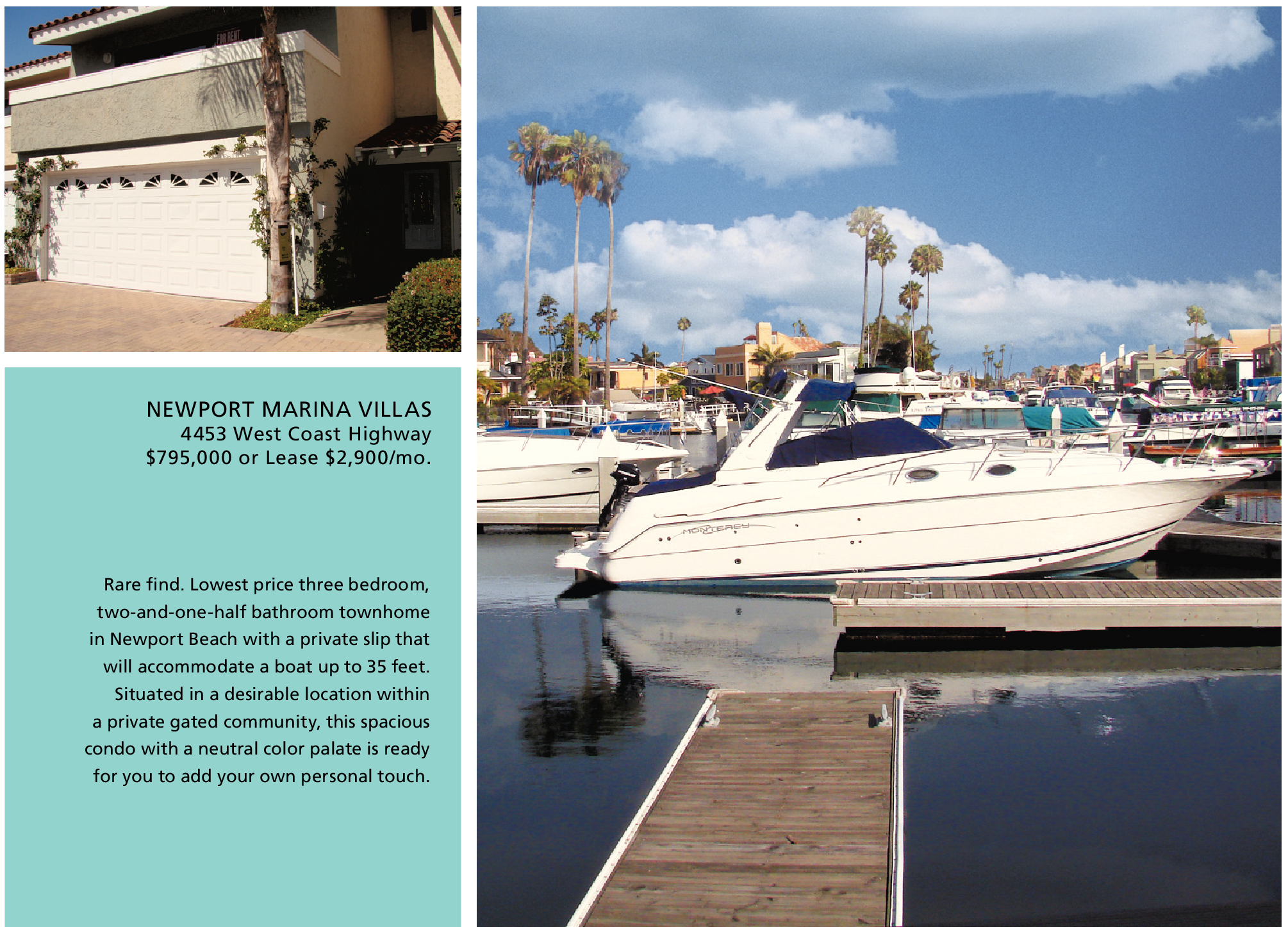 NEWPORT MARINA VILLAS 4453 West Coast Highway $795,000 or Lease $2,900/mo. Rare find. Lowest price three bedroom, two-and-one-half bathroom townhome in Newport Beach with a private slip that will accommodate a boat up to 35 feet. Situated in a desirable location within a private gated community, this spacious condo with a neutral color palate is ready for you to add your own personal touch. See alsoNewport Beach > $3,100,000 Rick Langevin 949.933.2777RANCHO SAN JOAQUIN 8 Montanas Sud >...NEWPORT COAST 23 Via Diamante > $2,990,000 or $11,500/mo.NEWPORT COAST 11 Splendore Drive >...NEWPORT COAST $4,650,000 Tuscan...NEWPORT COAST $2,999,000 or $12,000/mo.NEWPORT COAST $2,485,000