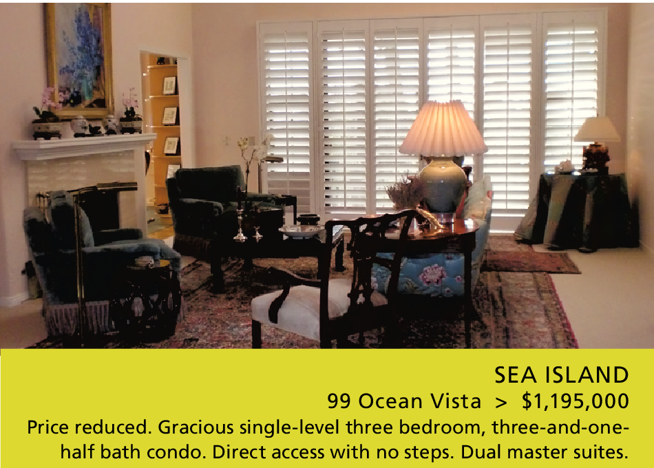 SEA ISLAND 99 Ocean Vista > $1,195,000 Price reduced. Gracious single-level three bedroom, three-and-onehalf bath condo. Direct access with no steps. Dual master suites.