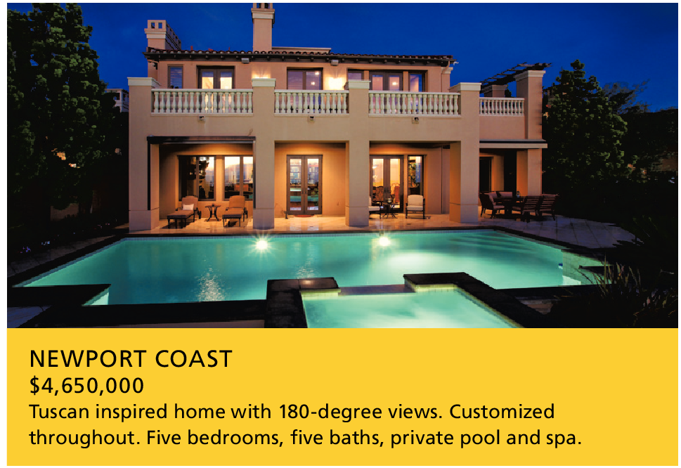 NEWPORT COAST $4,650,000 Tuscan inspired home with 180-degree views. Customized throughout. Five bedrooms, five baths, private pool and spa. See alsoNewport Beach > $3,100,000 Rick Langevin 949.933.2777NEWPORT MARINA VILLAS 4453 West Coast Highway $795,000 or Lease ITALIAN VILLA ON 5 ACRESNEWPORT COAST 23 Via Diamante > $2,990,000 or $11,500/mo.NEWPORT COAST 11 Splendore Drive >...NEWPORT COAST $2,999,000 or $12,000/mo.NEWPORT COAST $2,485,000To sell home this summer, prepare now