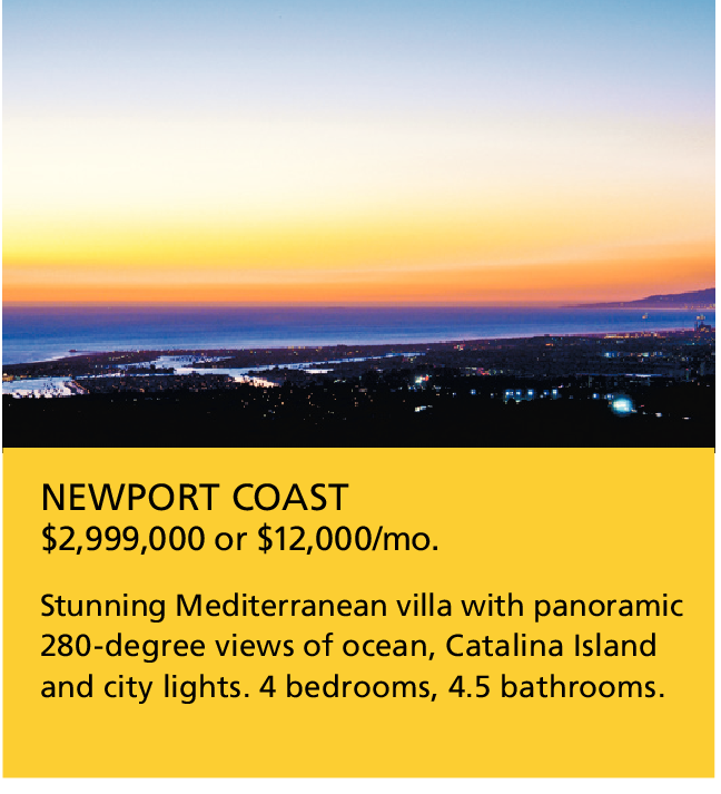 NEWPORT COAST $2,999,000 or $12,000/mo. Stunning Mediterranean villa with panoramic 280-degree views of ocean, Catalina Island and city lights. 4 bedrooms, 4.5 bathrooms. See alsoMONARCH POINT MEDITERRANEANNewport Beach > $3,100,000 Rick Langevin 949.933.2777NEWPORT MARINA VILLAS 4453 West Coast Highway $795,000 or Lease ITALIAN VILLA ON 5 ACRESNEWPORT COAST 23 Via Diamante > $2,990,000 or $11,500/mo.NEWPORT COAST 11 Splendore Drive >...NEWPORT COAST $2,485,000NEWPORT COAST $4,650,000 Tuscan...